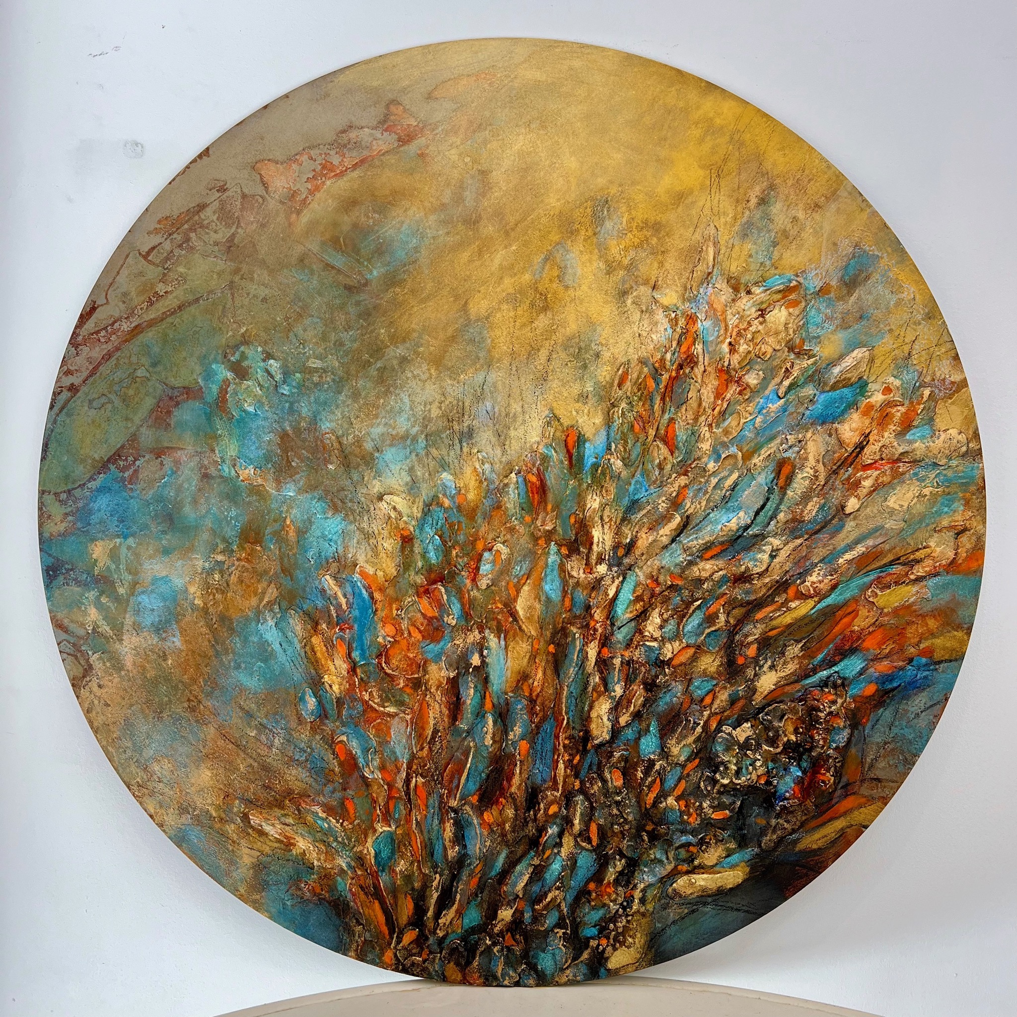 Composition florale harmonieuse, tout en relief et en lumère dorée, orange et bleue.