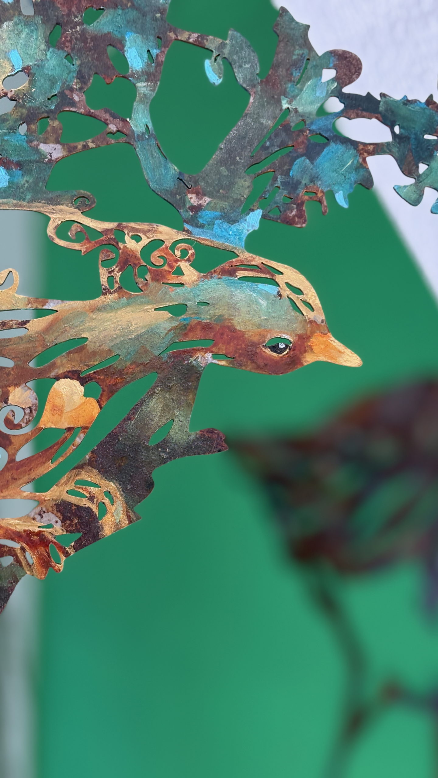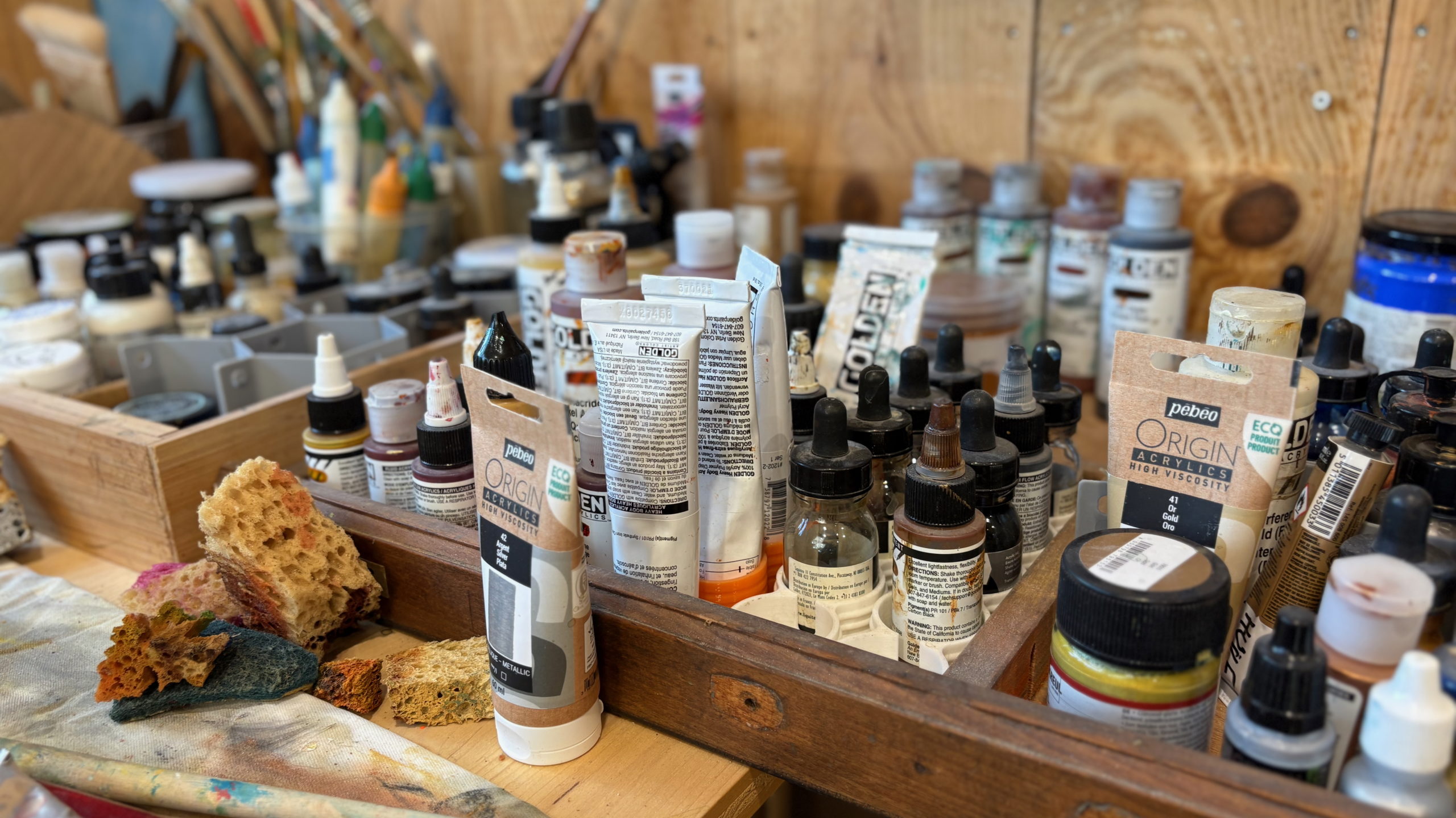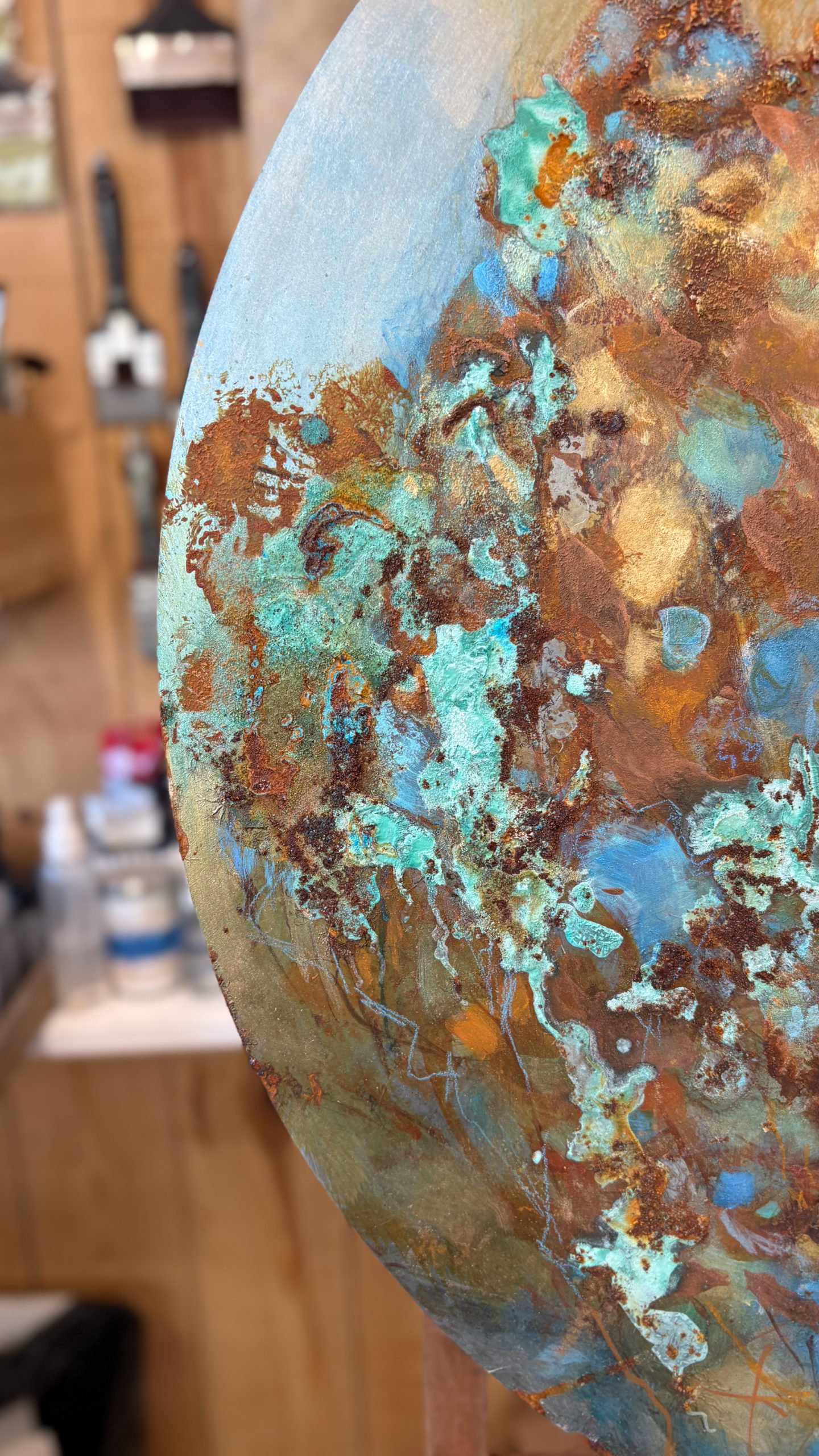 Dans mon atelier, le désordre et l’harmonie cohabitent. Les pigments se mêlent aux tubes, mes toiles d’acier se cumulent comme des imaginaires en devenir. Le tumulte des objets n’est pas chaos mais langage : j’aime avoir sous la main, dans mon champs visuels tous mes compagnons.